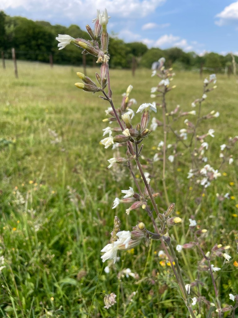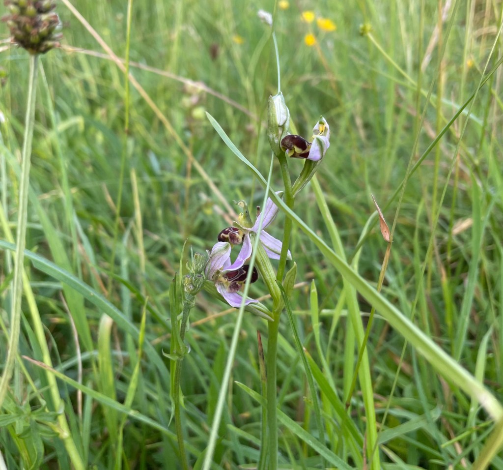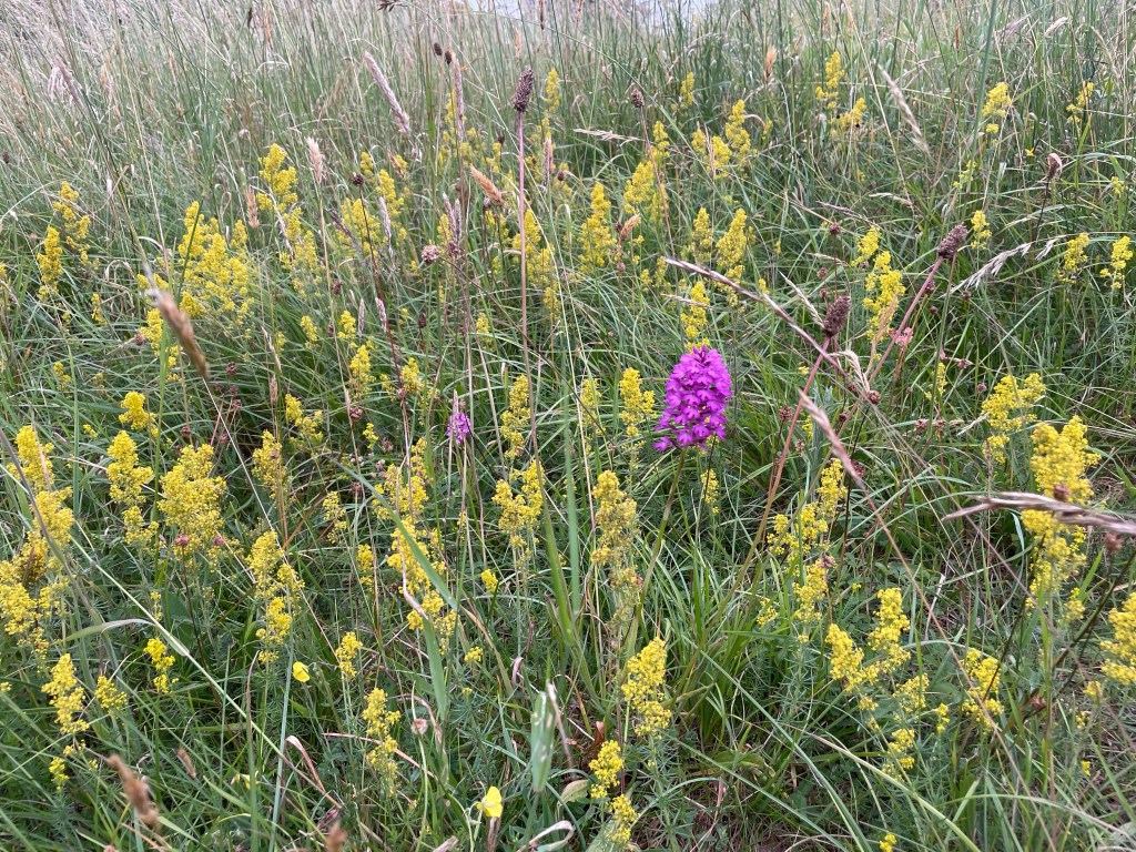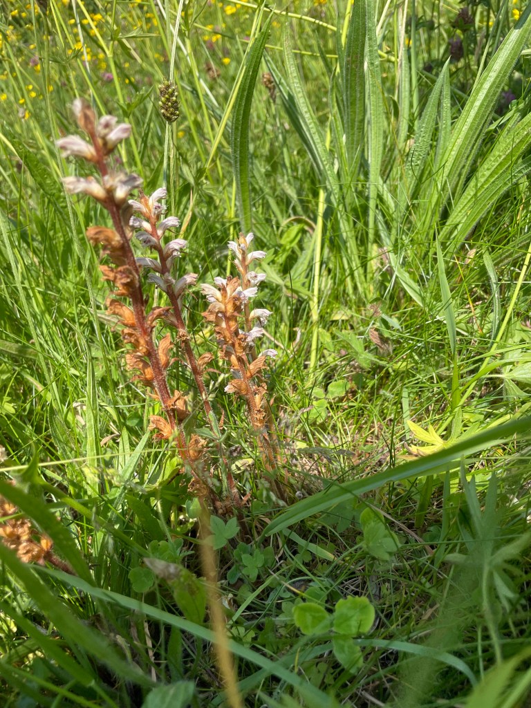 In June 2023 these plants were identified: cowslip, common bromerape, yorkshire fog, sheep’s sorrel, yellow rattle, lady bedstraw, yellow trefoil, black medic, bent grass, false oat grass, speedwell, hogweed (small), common spotted orchid, pyramidal orchid, false goatsbeard, hypericum, birds nest orchid, white campion, heal all, bee orchid.