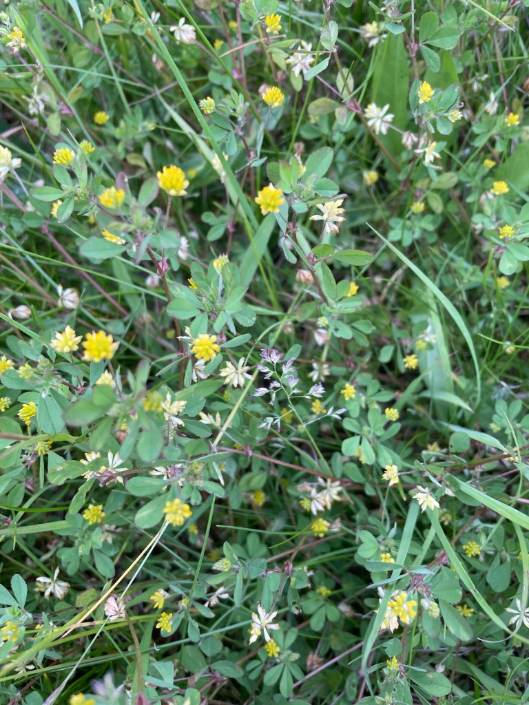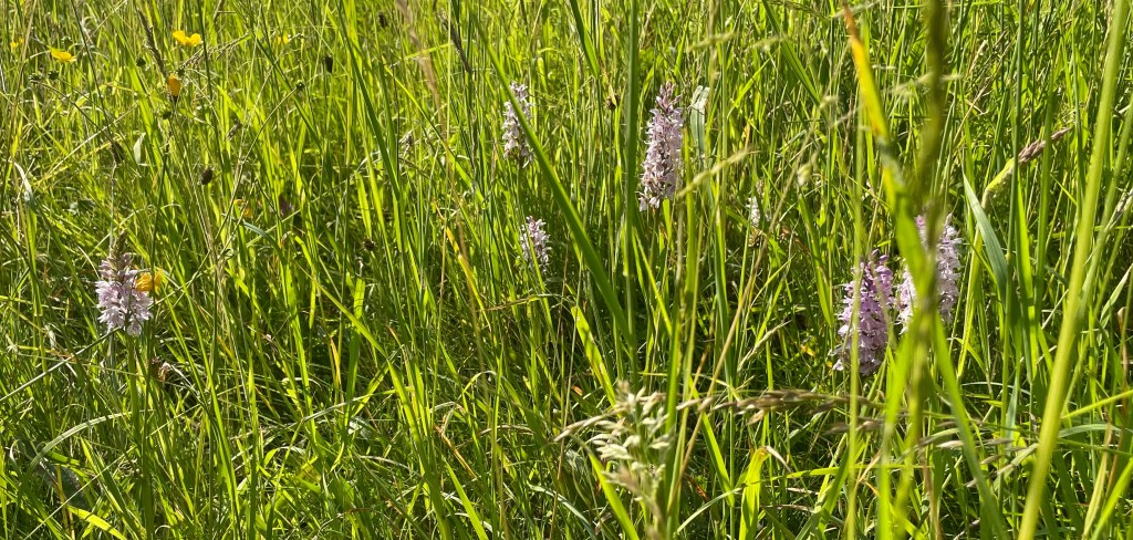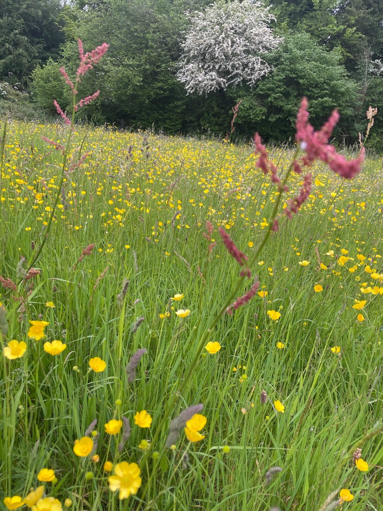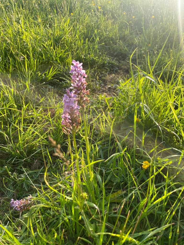 In June 2023 these plants were identified: cowslip, common bromerape, yorkshire fog, sheep’s sorrel, yellow rattle, lady bedstraw, yellow trefoil, black medic, bent grass, false oat grass, speedwell, hogweed (small), common spotted orchid, pyramidal orchid, false goatsbeard, hypericum, birds nest orchid, white campion, heal all, bee orchid.