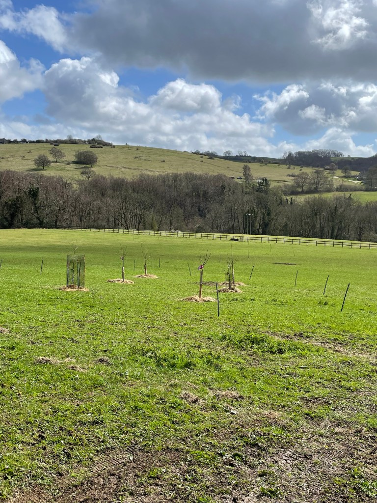 The field had no name, just ‘Land in Cranham’. We researched old Tithe maps dating back to 1745 and discovered that it was called ‘ The Far Ground on those maps. It used to be part of Woodside Farm next door, and we presume named because it was the furthest field away from the farmhouse. So we decided to resurrect the old name, and it is now known as Far Ground.
