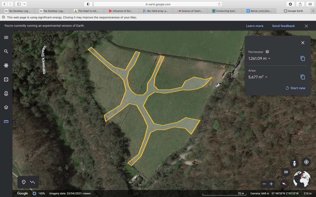 We want to create a horse track that connects the all paddocks to the stables, which has huge benefits for the horses keeping them moving and giving them choices.But where to start? Walking round the very large field was a bit overwhelming, it seemed hard to know where to start. In the end I downloaded a Google earth image of the field and mapped out a layout on there.