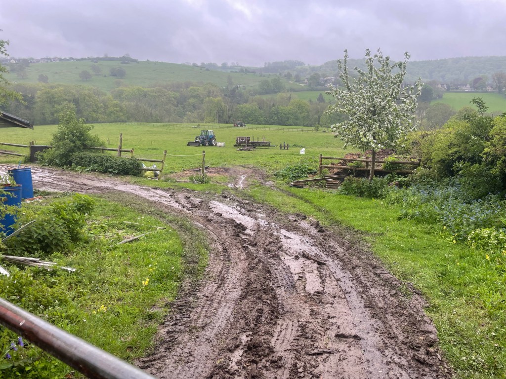 Firstly we want to encourage a wildflower meadow and do some planting of trees and bushes to encourage biodiversity.We did a lot of research and sought advice from all sorts of sources as to how to improve the grass cover, it looked so bare at the end of winter. Farmers suggested harrowing and seeding, conservationists said do nothing and wait …. which is what we did.Our vision is to divide the field into small paddocks which will make rotational grazing easier, and to create wildlife/planted corridors between the paddocks. Also to plant a little orchard up near the stable area.The entrance to the field is horrendous, it is narrow, steep and exits onto the quite fast road blindly just below the brow of the hill. So we need to create a new entrance somewhere.